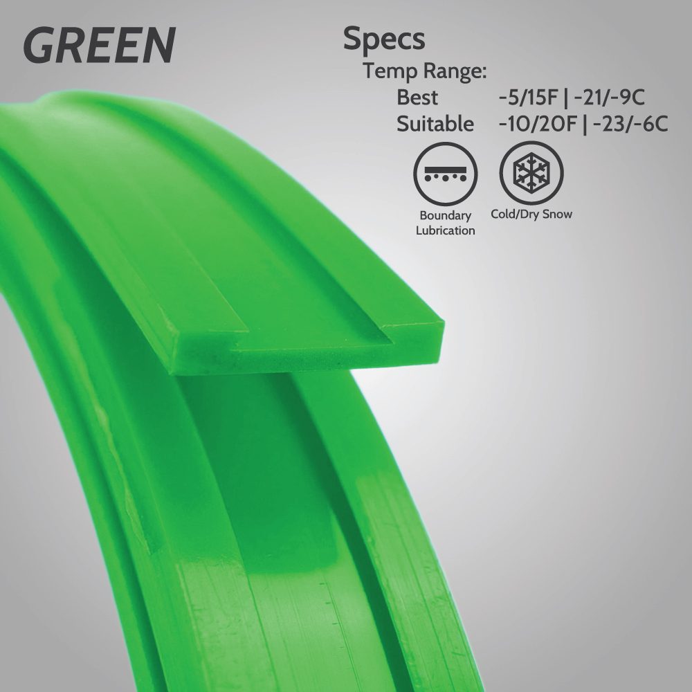 GREEN: The GREEN FCP Runner Plastic is the second of our wax impregnated plastics.  Same attributes as the light blue but with a cold weather temperature wax, making it glide best between -5 degrees F (-21 degrees C) and 15 degrees (-9 degrees C).